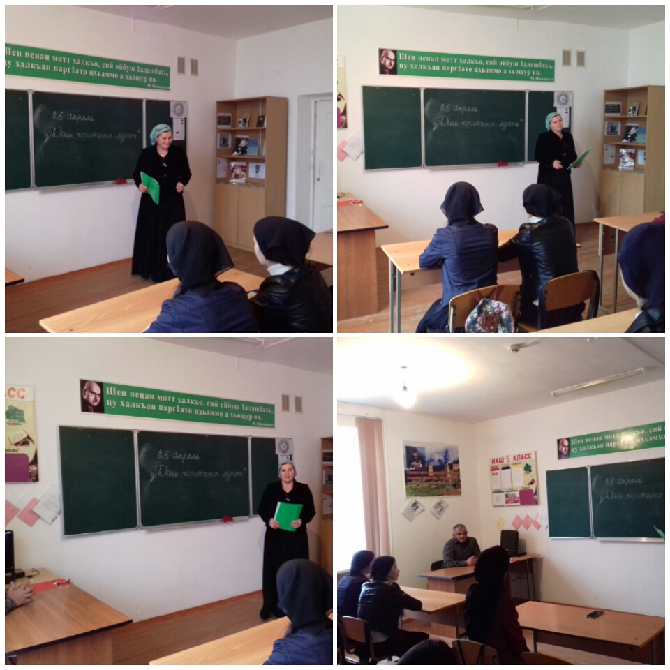 В 8 классе был проведен классный час на тему "День чеченского языка"Присутствовал учитель чеченского языка Альмаев К.К.